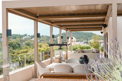 With its panoramic views of the Vouliagmeni Bay, fully furnished terrace and sundeck with private open-air jacuzzi among Mediterranean aromatic plants, this is really the suite of dreams.
